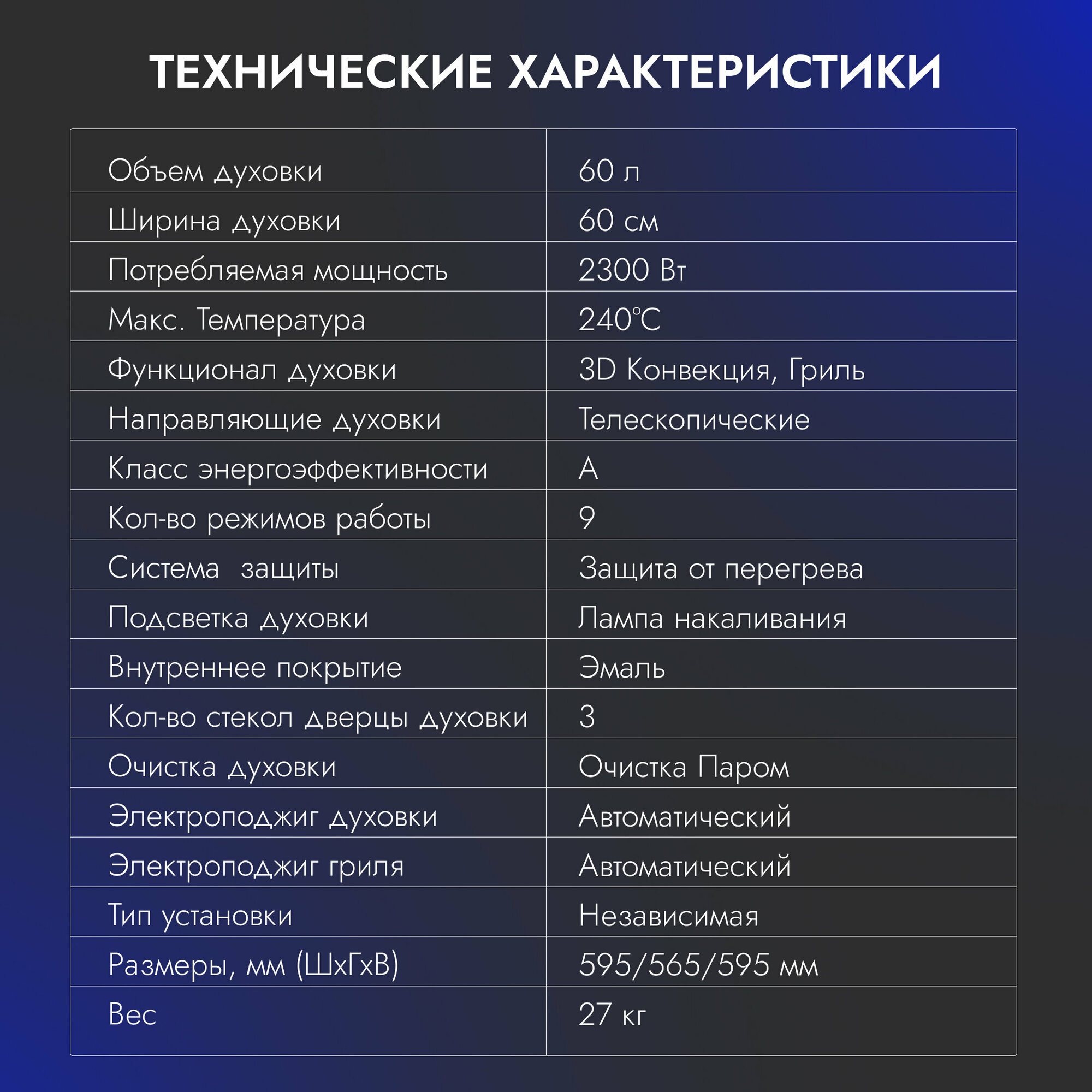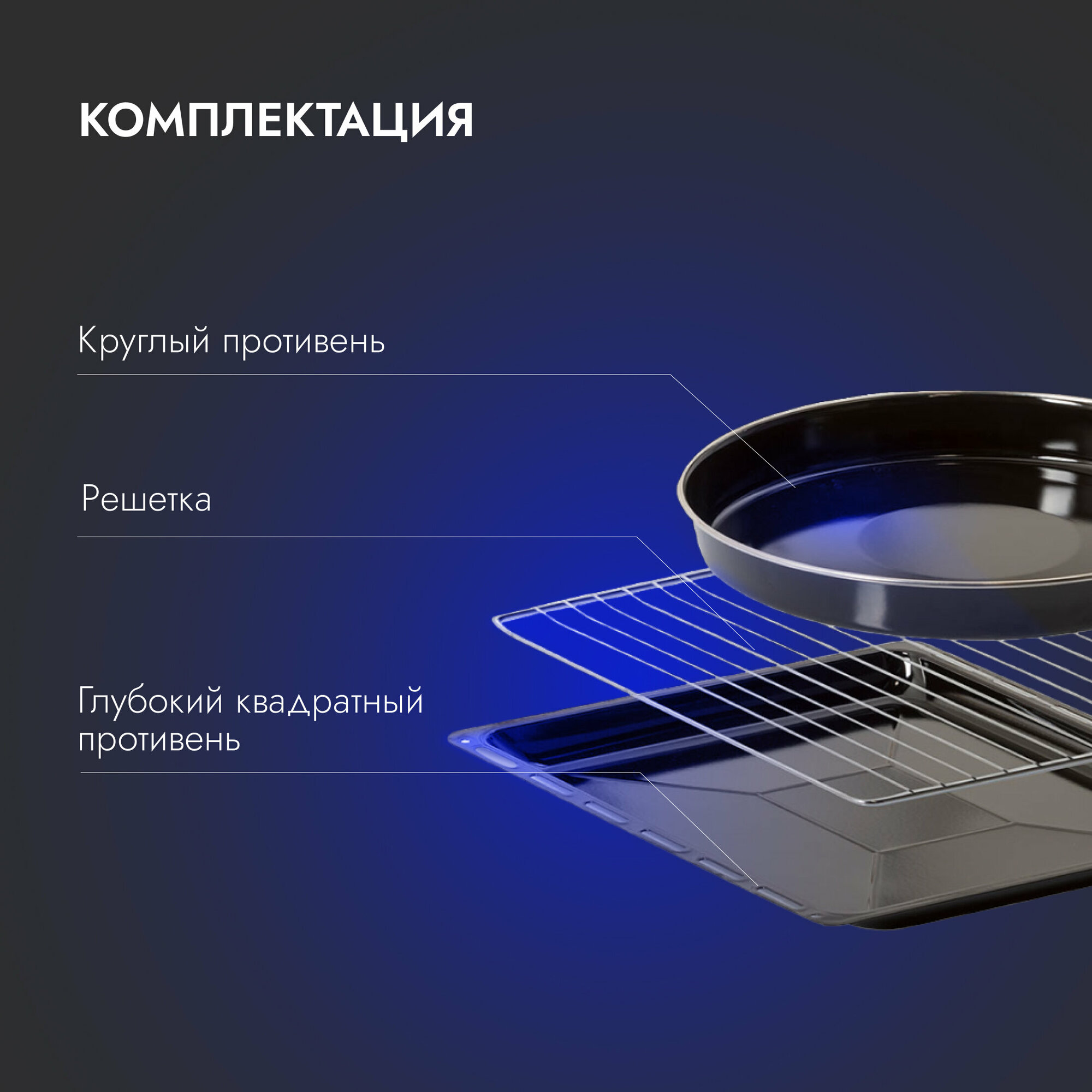 | Подробная комплектация | Духовой шкаф, шнур для подключения, инкструкция, противень, дополнительный противень |