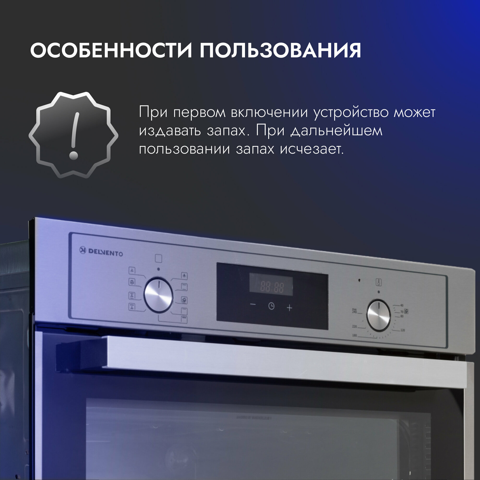 СохранитьДуховой шкаф электрический 60 см DELVENTO V6EM59011 9 режимов (гриль + конвекция) / дисплей / таймер 90 мин, часы / очистка паром / телескоп. направляющие / хром. решетка и 2 противня: стандартный + круглый / подсветка интересное: