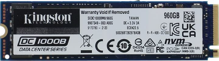 Диск Kingston 960GB DC1000B M.2 2280 NVMe R/W 3400/925MB/s IOPs 199 000/25 000, 1095 TBW, DWPD 0.6 (5 лет)