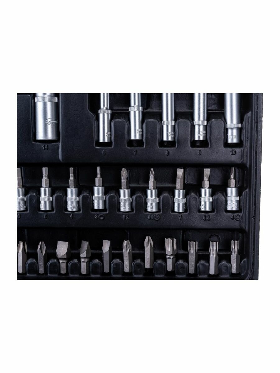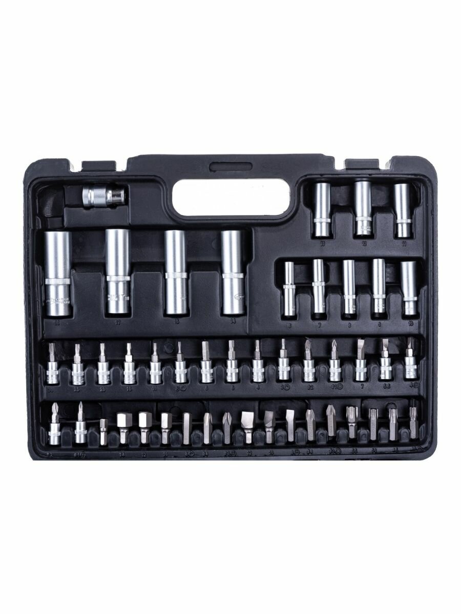 | Головки торцевые подробно | 1/4": 4, 4.5, 5, 5.5, 6, 7, 8, 9, 10, 11, 12, 13, 14 мм; длинные 1/4": 6, 7, 8, 9, 10, 11, 12, 13 мм; трещотка 1/4": 45 зубов; вороток т-образный 1/4"; удлинитель 1/4": 50, 100 мм; гибкий удлинитель 1/4": 150 мм; карданный шарнир 1/4"; 1/2": 10, 11, 12, 13, 14, 15, 16, 17, 18, 19, 20, 21, 22, 24, 27, 30, 32 мм; длинные 1/2": 14, 15, 17, 19, 22 мм; свечные 1/2": 16, 21 мм; трещотка 1/2": 45 зубов; удлинитель 1/2": 125, 250 мм; карданный шарнир 1/2"; с битами 1/4": H3, H4, H5, H6, T10, T15, T20, T25, T27, T30, SL4, SL5.5, SL6.5, PH1, PH2, PZ1, PZ2 |