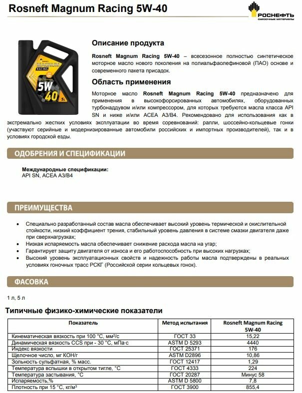 Ниже Вы можете прочитать отзывы на Роснефть Magnum Racing 5W-40 (рнпк) SN/A3/B4 моторное масло синт. кан. 5 л 40801650, ознакомится с подробными характеристиками, посмотреть интересные обзоры и фотографии на Роснефть Magnum Racing 5W-40 (рнпк) SN/A3/B4 моторное масло синт. кан. 5 л 40801650.