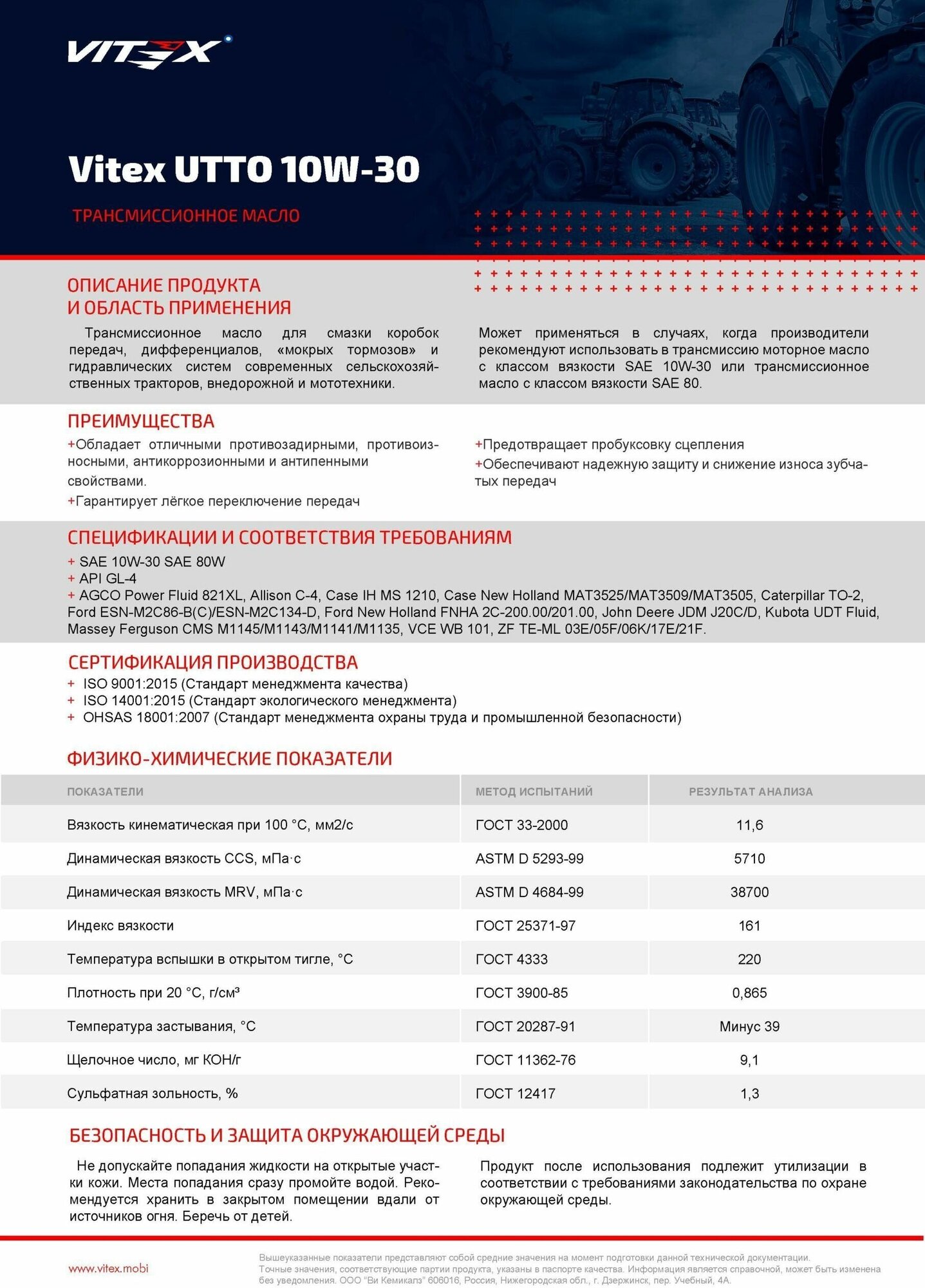 Vitex Utto 10W30 Sae 80W 20Л Vitex арт. V337906 интересное: