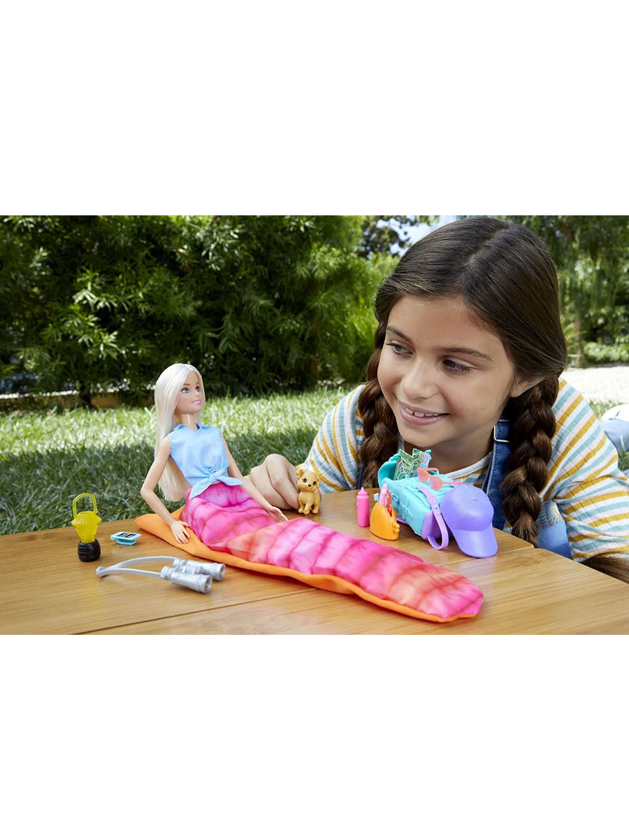 Barbie Кукла Малибу Кемпинг кукла с питомцем и аксессуарами, HDF73