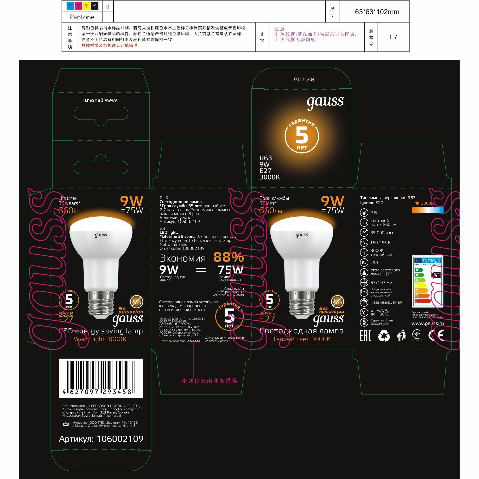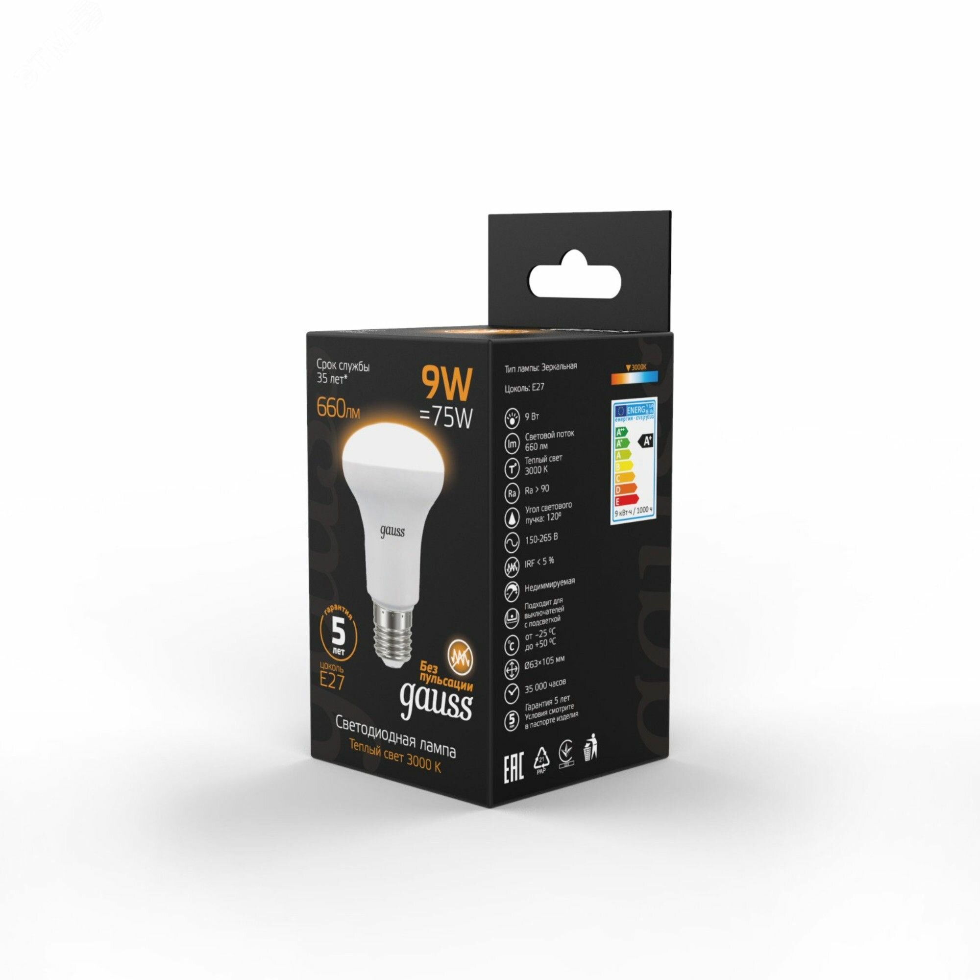 Лампа светодиодная gauss 106002109, E27, R63, 9 Вт, 3000 К