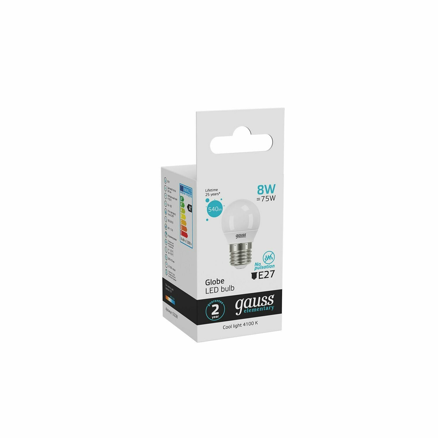 Купить Gauss Elementary Шар G45 E27 8W(540lm) 4100K 4K 82x45 матовая, пластик/алюм. 53228