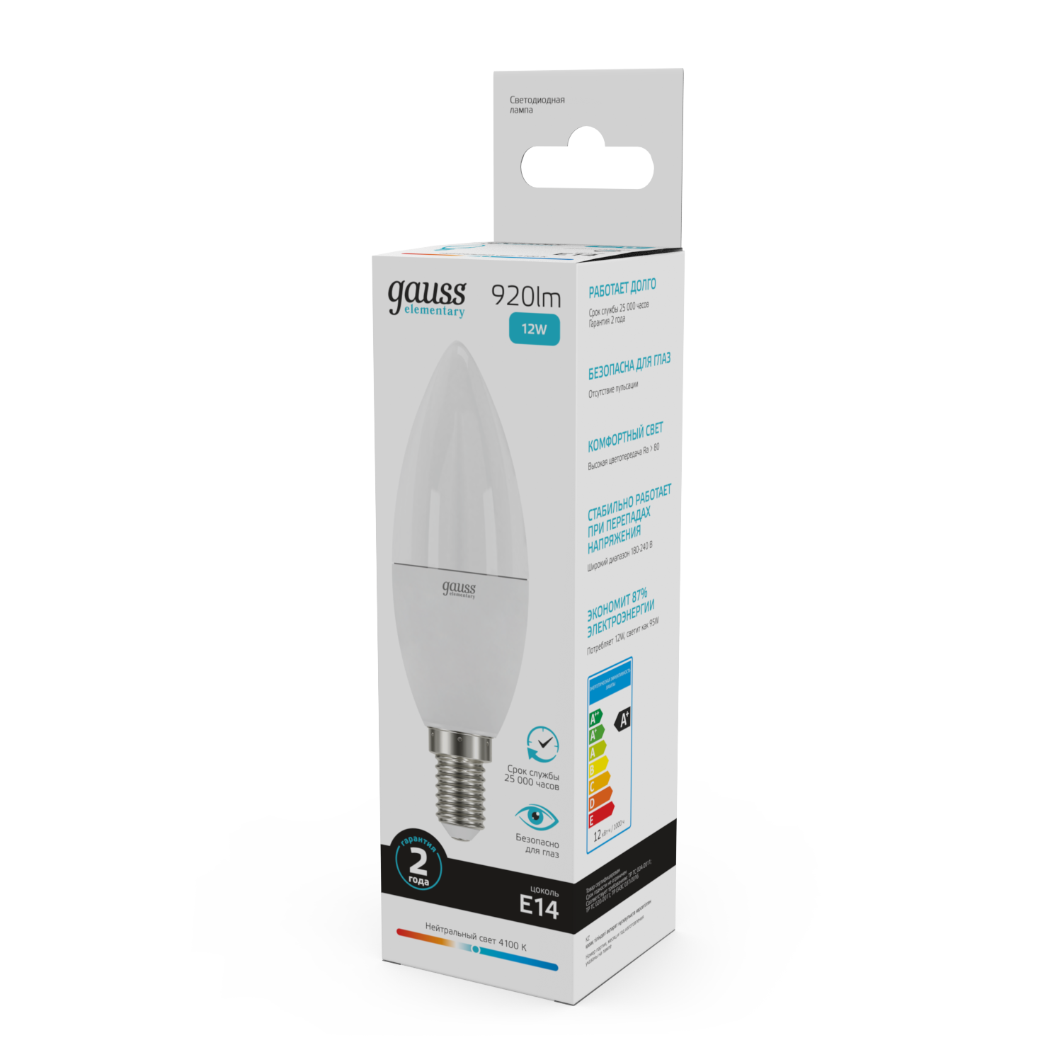 Лампа светодиодная Gauss Elementary 12Вт цок.:E14 свеча 220B 4100K св.свеч.бел.нейт. C37 (упак.:10шт) (33122)