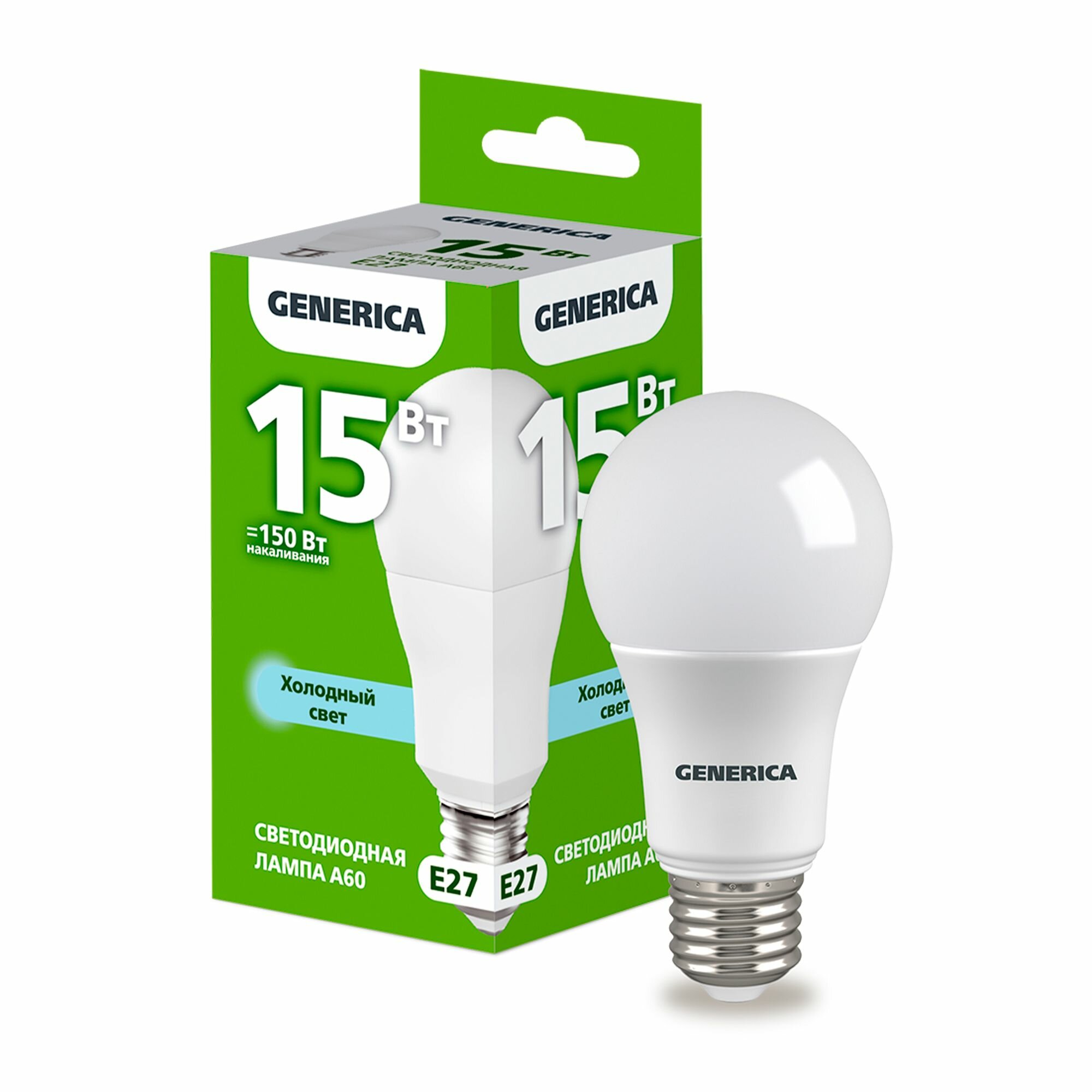 GENERICA Лампа светодиодная GENERICA A60, 15 Вт, груша, 6500 К, E27, 230 В, LL-A60-15-230-65-E27-G