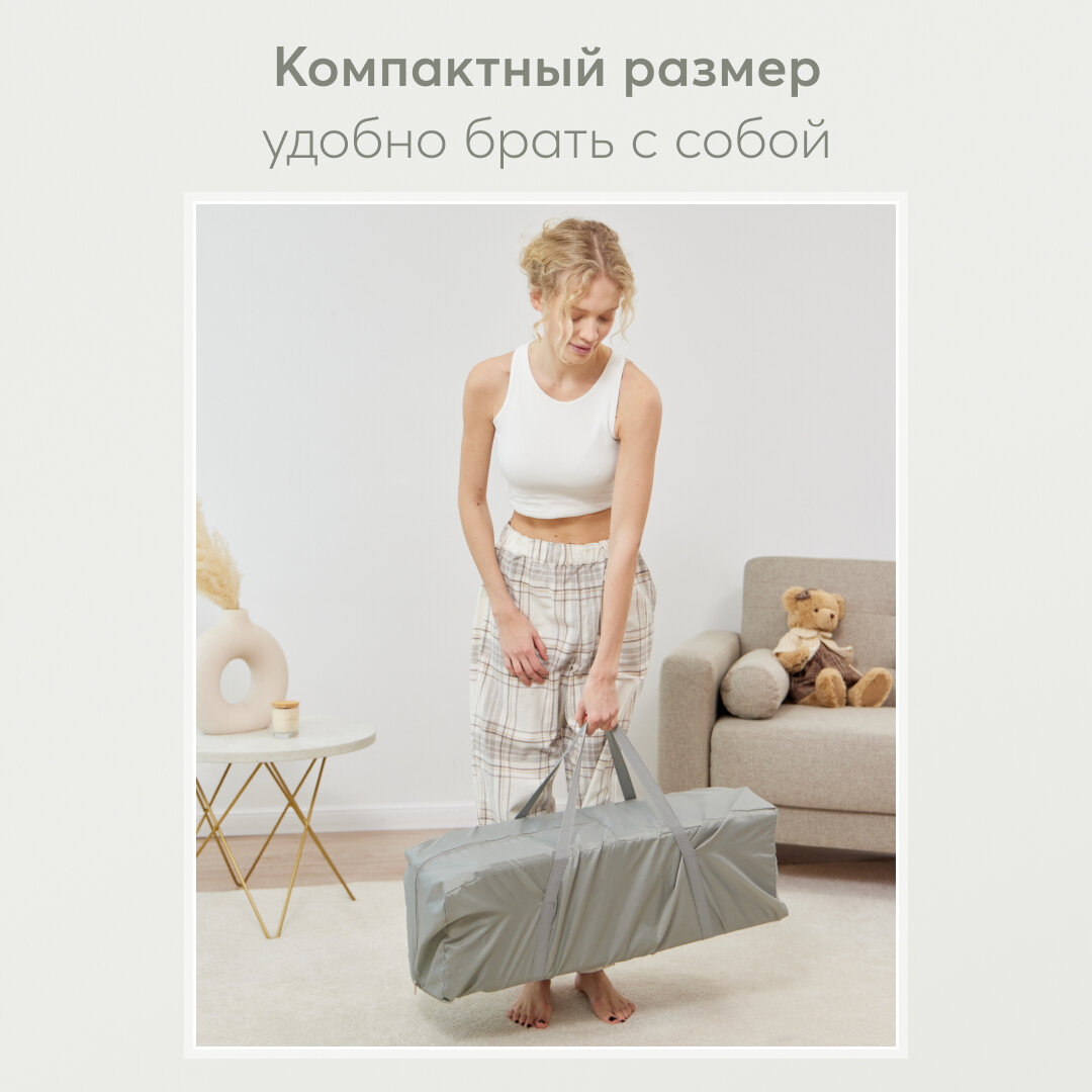 Легко собрать и разобрать. Есть колесики, можно легко двигать по квартире. Матрас тоже легко устанавливается. Удобный вариант на первое время. |