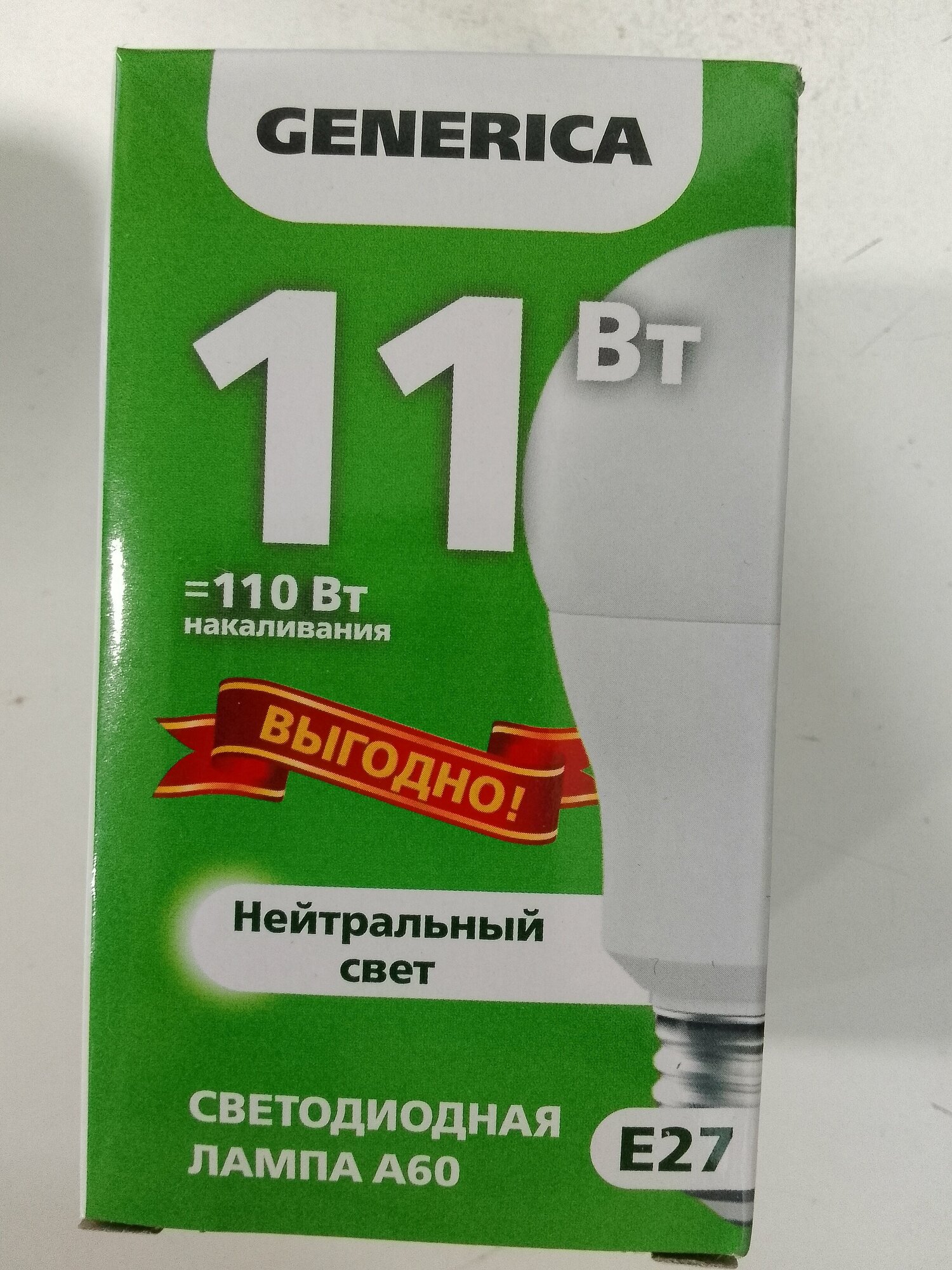 (7 шт.) Светодиодная лампочка GENERICA A60 груша, мощность 11 Вт, напряжение питания 220 В, цоколь Е27, цветовая температура 4000 К, нейтральный белый свет, световой поток 1200 Лм, размер 60х108 мм