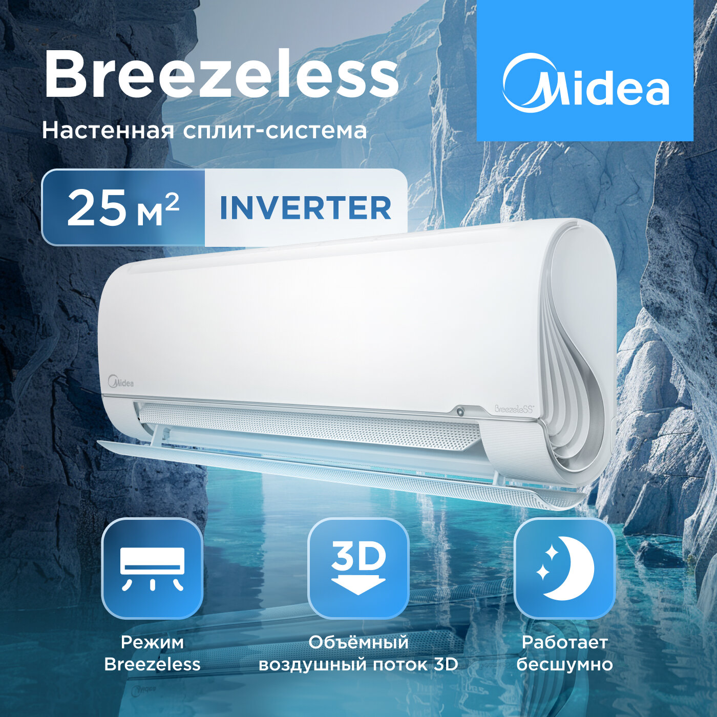 Облачный кондиционер инвертор Midea Breezeless MSFA1-09N8D6-I/MSFA1-09N8D6-O_cloud (встроен Wi-Fi контроллер с бессрочной подпиской), для помещений до 25 кв.м.