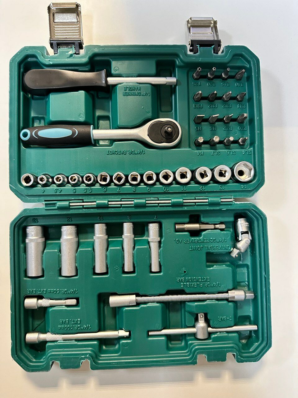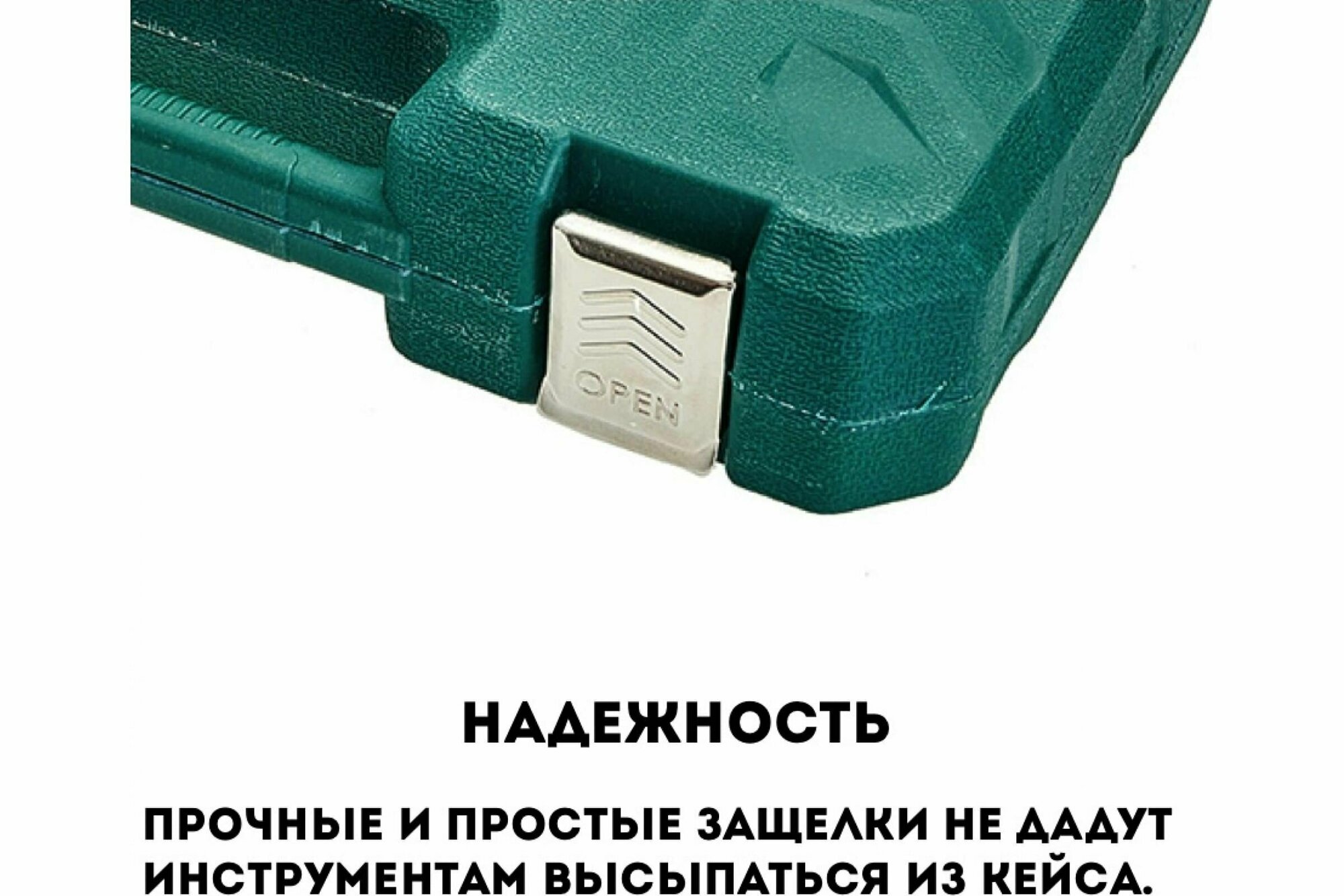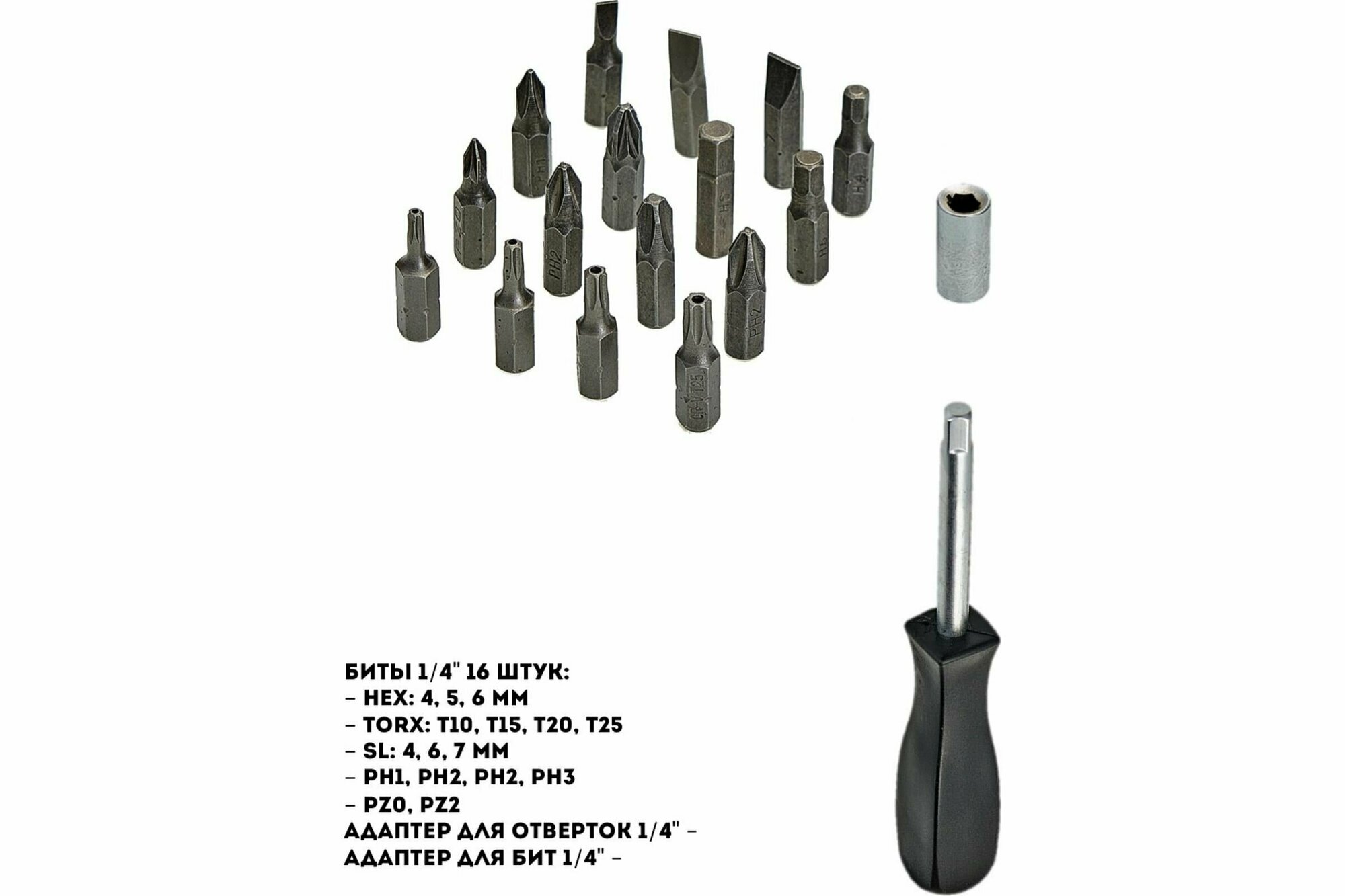 | Ручной инструмент подробно | рукоятка реверсивная (трещотка) 1/4" с функцией быстрого сброса – 155 мм, храповый механизм с 45 зубьями, рабочий угол 8°; вороток Т-образный 110 мм; рукоятка для торцевых головок 1/4"; |