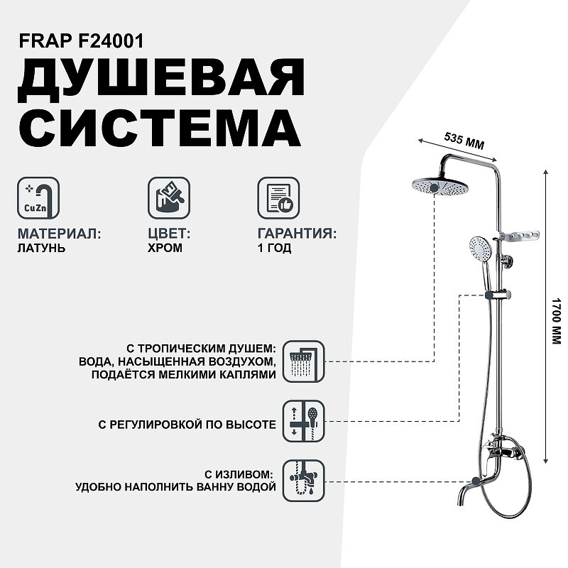 Ниже Вы можете прочитать отзывы на Душевая система Frap F24001 Хром, ознакомится с подробными характеристиками, посмотреть интересные обзоры и фотографии на Душевая система Frap F24001 Хром.