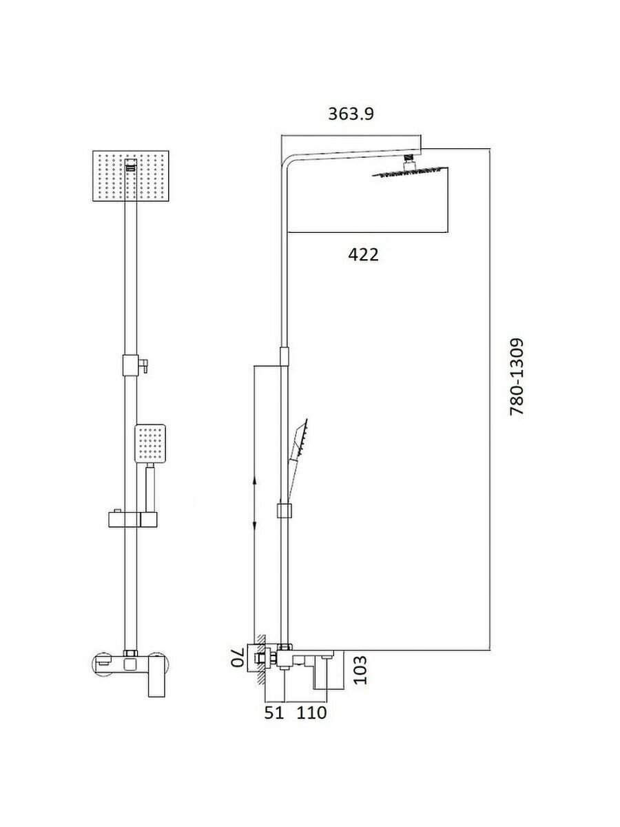 Смеситель Rossinka RS46-45 для душа с регулируемой высотой штанги и лейкой "Тропический дождь"