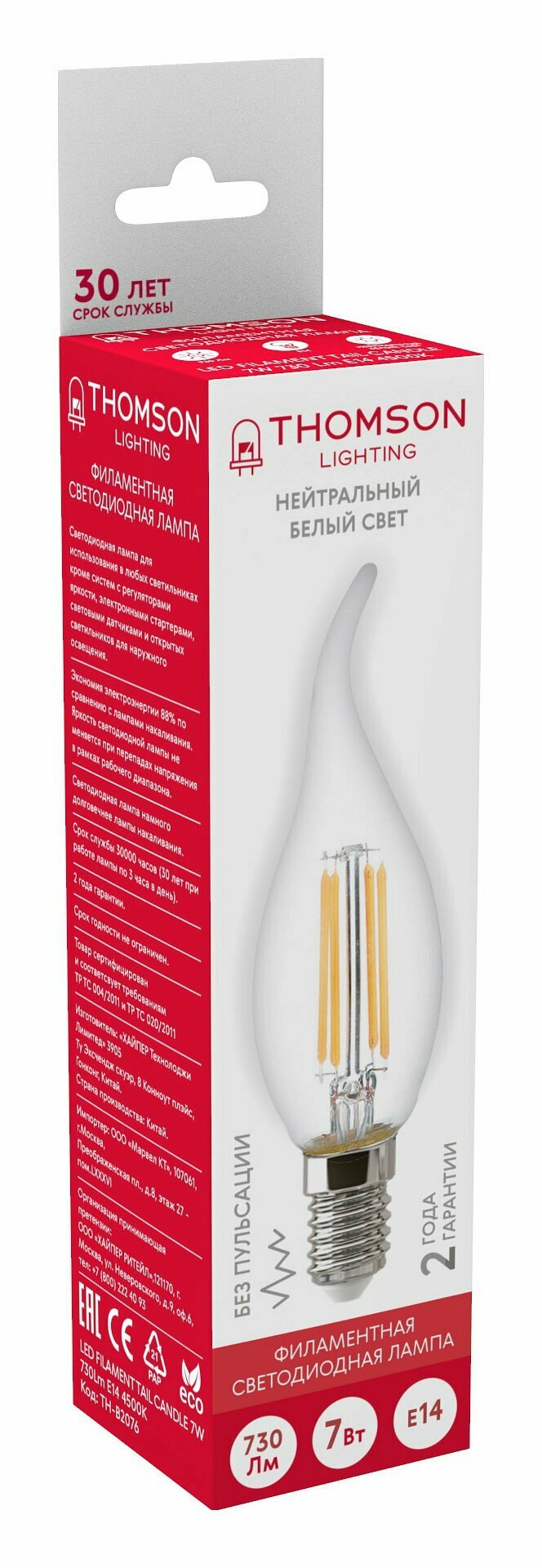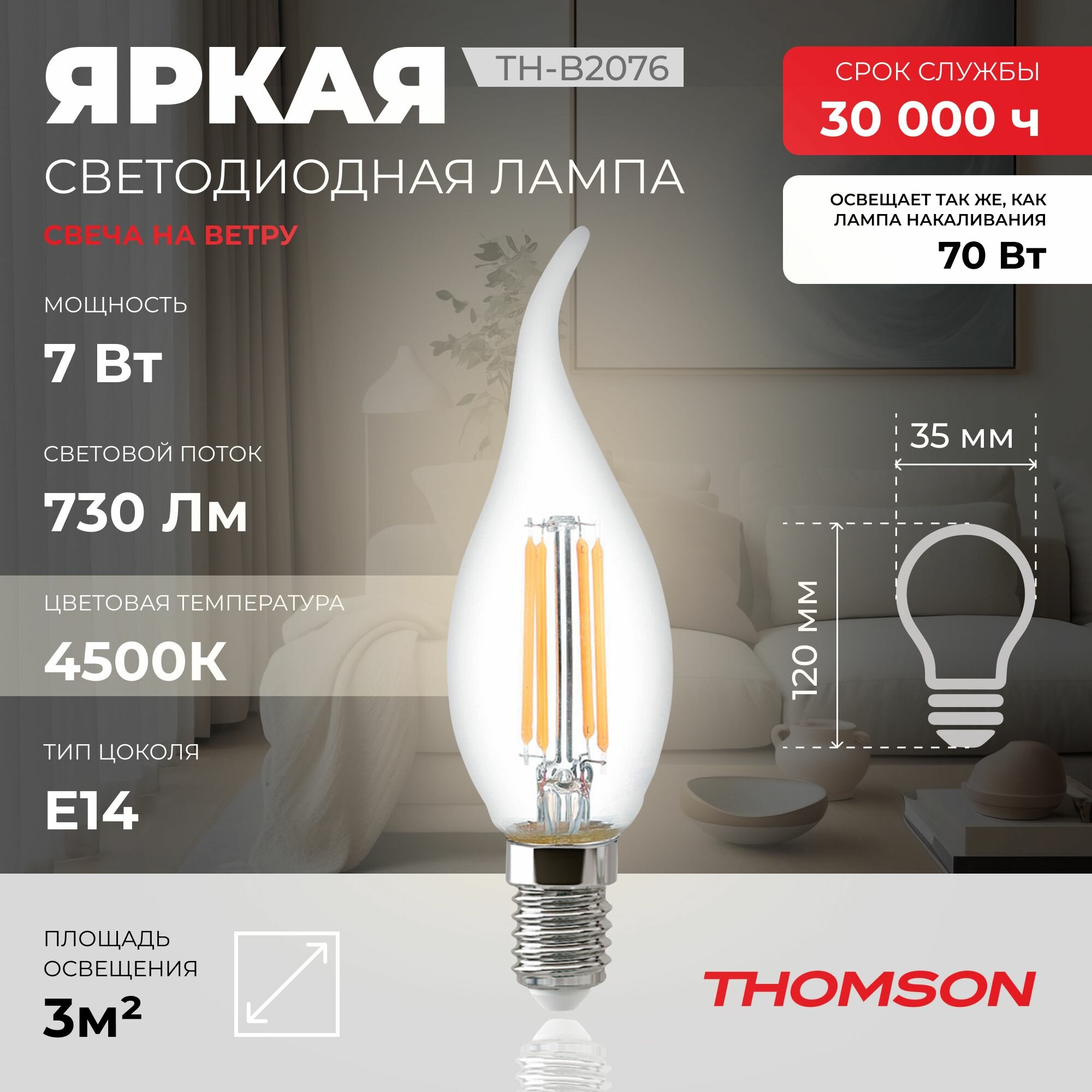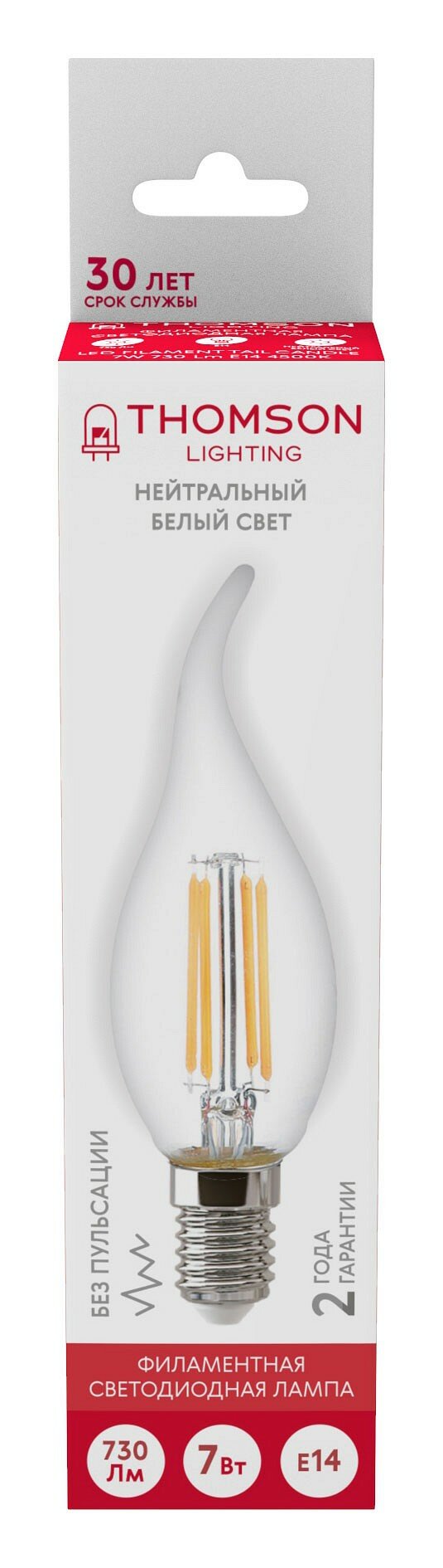 Купить Лампочка Thomson филаментная TH-B2076 7 Вт, E14, 4500K, свеча на ветру, нейтральный белый свет