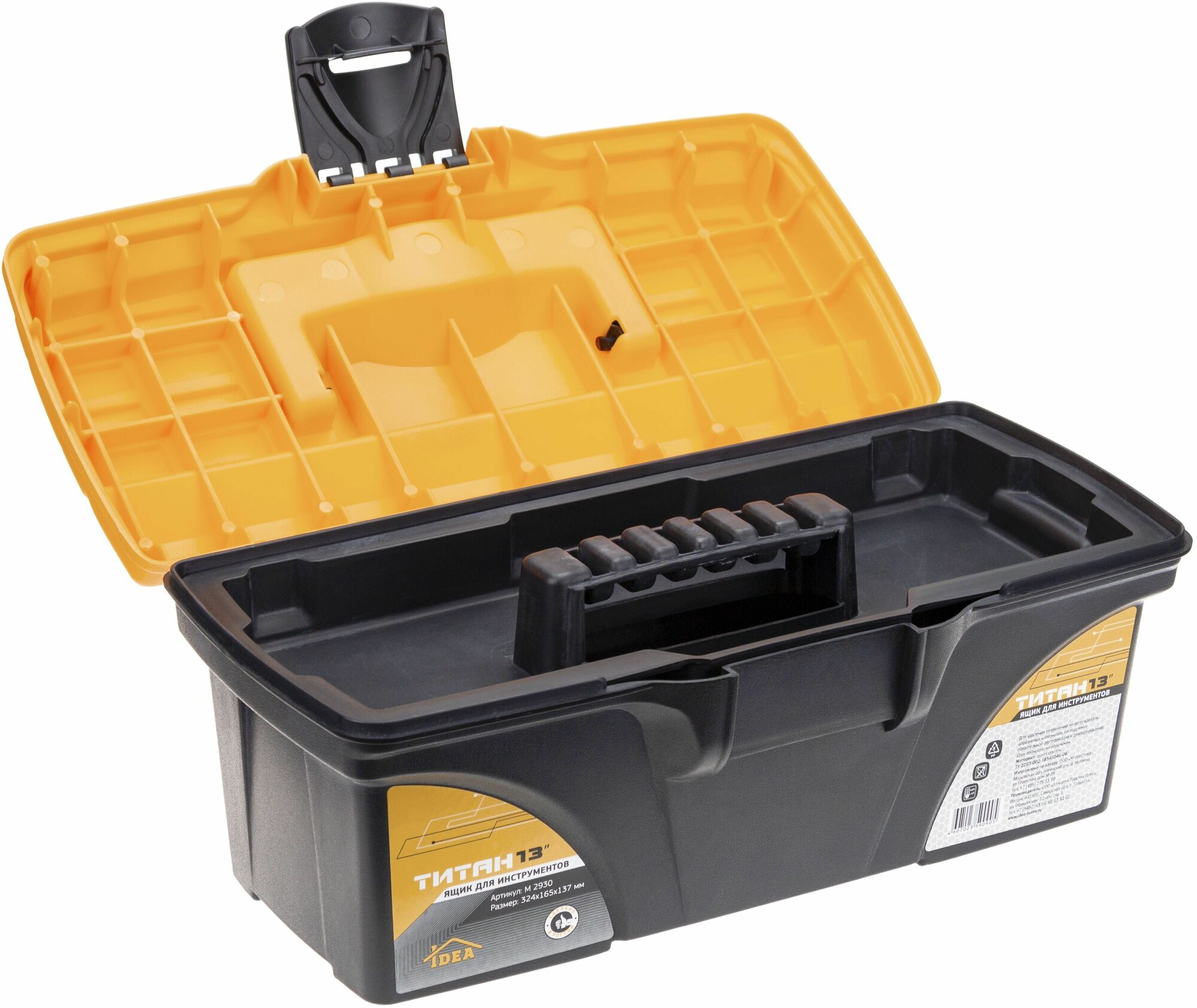 | Подробная комплектация | Ящик для инструментов ТИТАН 13' (черный с желтым), 165х324 мм, высота 137 мм, 1шт. |