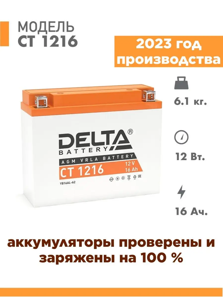 Мото аккумулятор стартерный Delta CT 1216 12 В 16 Ач обратная полярность 200А (12V 16Ah) (YB16AL-A2) AGM, для мотоцикла, мопеда, скутера, квадроцикла, снегохода, дизельных генераторов