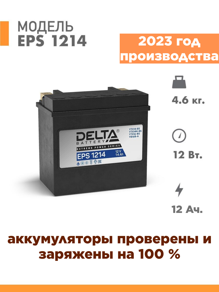 Аккумулятор мотоциклетный Delta EPS 1214 YTX14-BS. YTX14H-BS. YTX16-BS. YB16B-A 12V 12Ah Nano-Gel(залит и готов к применению)