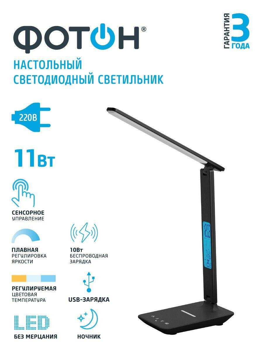 Фотон Настольный светильник светодиодный сетевой TL-11DRCH-B 11 Вт черный USB, Qi зарядка 24650