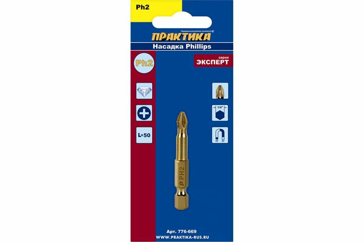Бита отверточная ПРАКТИКА "Эксперт-Алмаз" PH-2 х 50мм Tin (1шт), блистер (776-669)