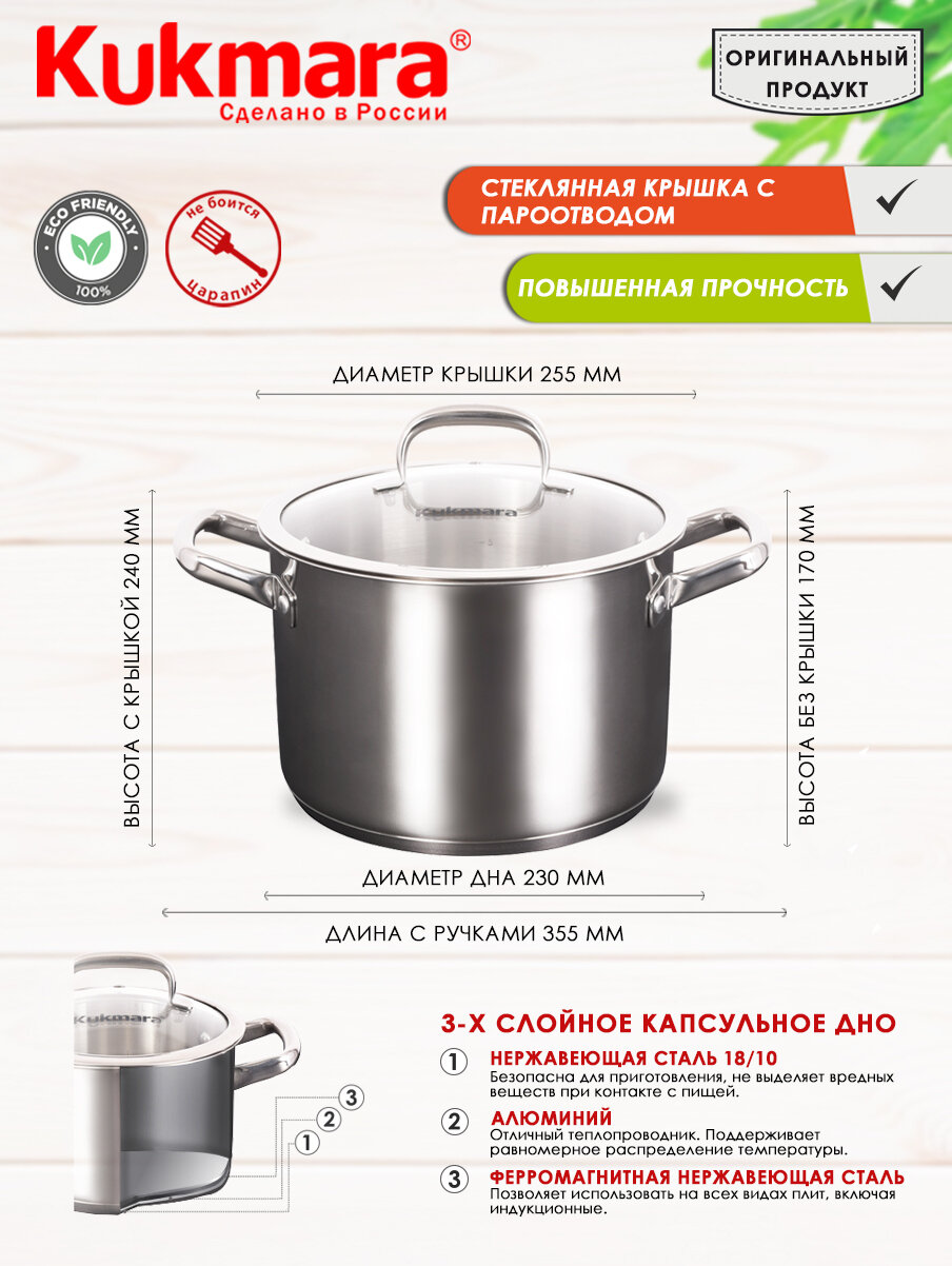 Кастрюля из нержавеющей стали со стеклянной крышкой Kukmara (Leon) LN-CA9026G, 9 л