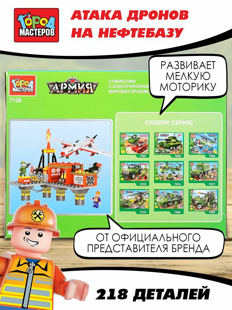 СохранитьКонструктор Город Мастеров Атака дрона на нефтебазу, с фигурками, 218 деталей (7126-KK) интересное: