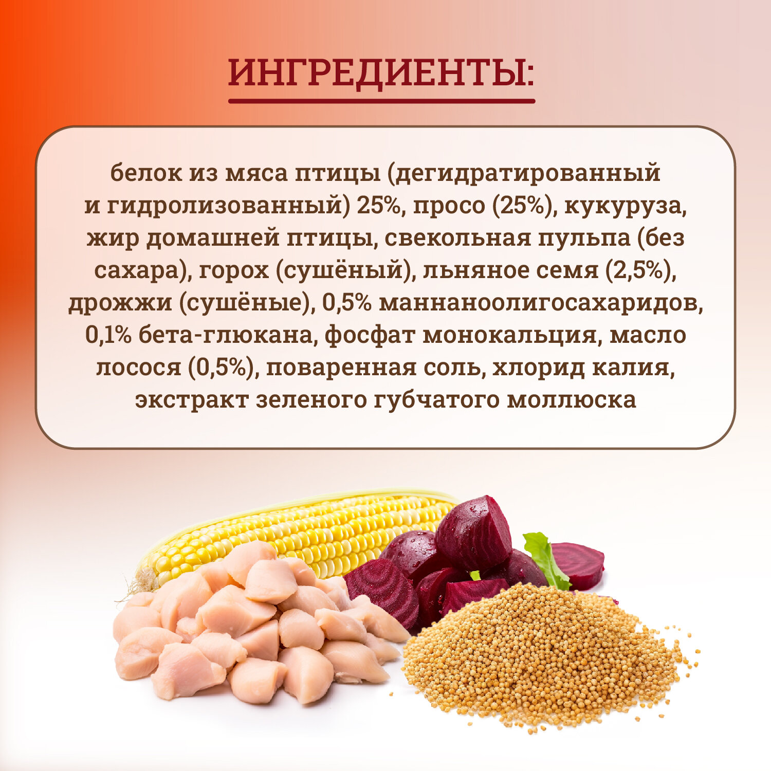 | Состав | белок из мяса птицы (дегидратированный и гидролизованный) 25 %, просо (25 %), кукуруза, жир домашней птицы, свекольная пульпа (без сахара), горох (сушёный), льняное семя (2,5 %), дрожжи (сушёные), 0,5 % маннана-олигосахаридов, 0,1 % бета-глюкана, фосфат монокальция, масло лосося (0,5 %), поваренная соль, хлорид калия, экстракт зеленого губчатого моллюска |