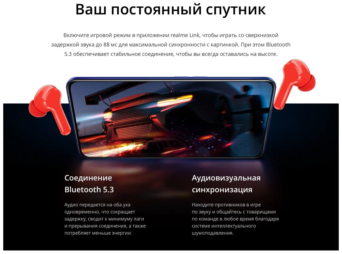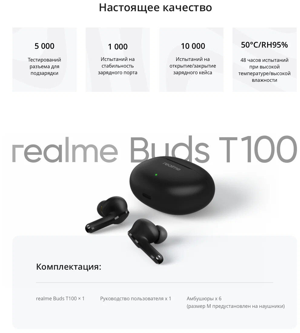 | Комплектация | realme Buds T100, руководство пользователя, амбушюры 6 шт |