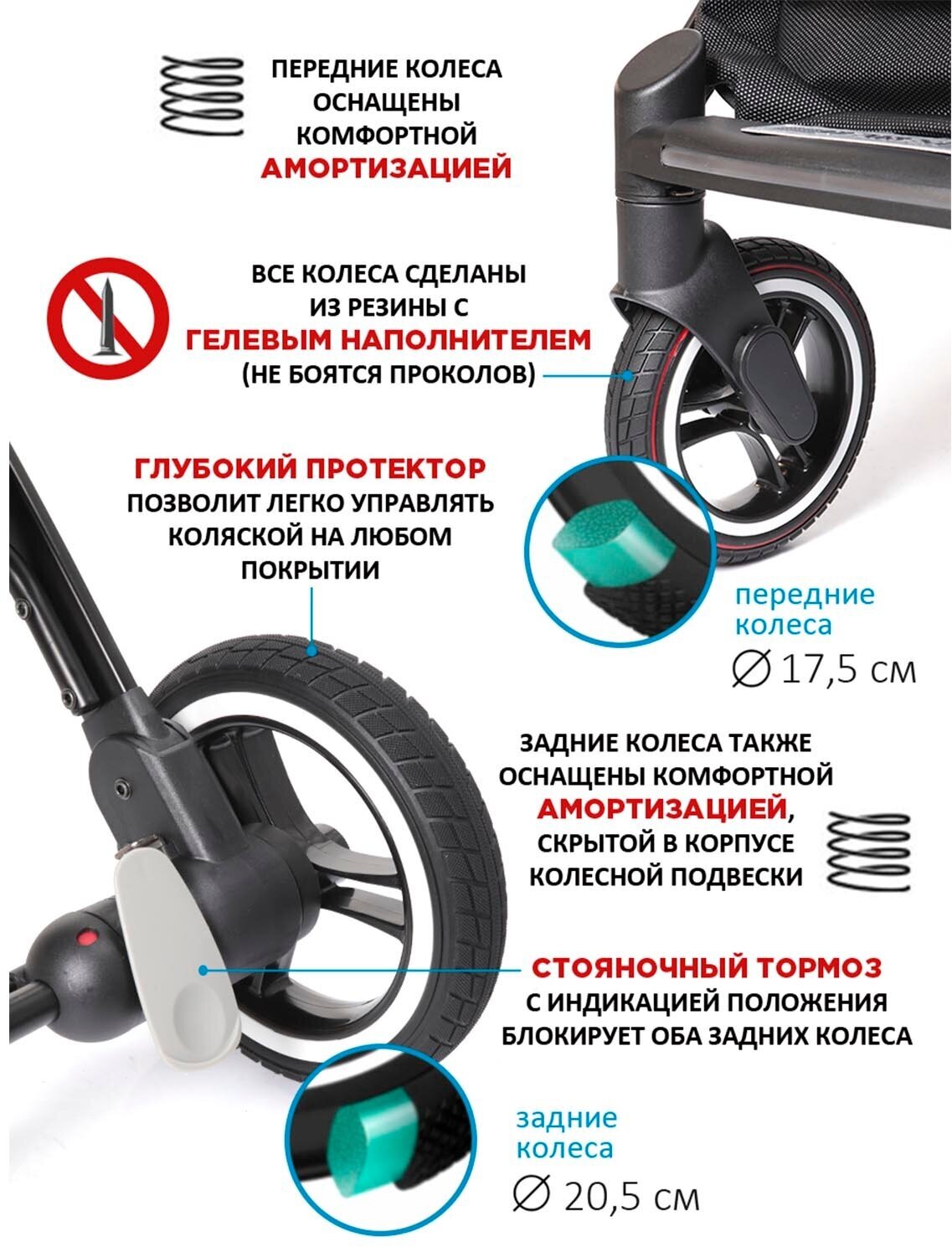 | Колеса | 4 шт., резиновые, 17.50-20.50 см |