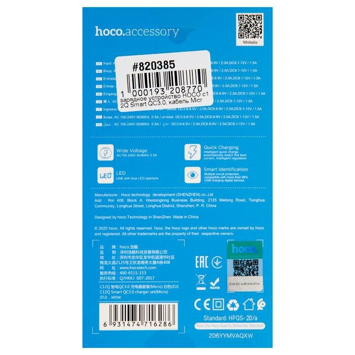 Блок питания HOCO С12Q Smart QC3.0, один порт USB, 5V, 3.0A, белый интересное: