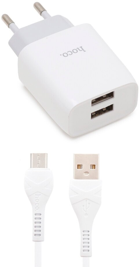 Сетевой адаптер питания Hoco C73A White зарядка 2.4А 2 USB-порта + кабель microUSB, белый