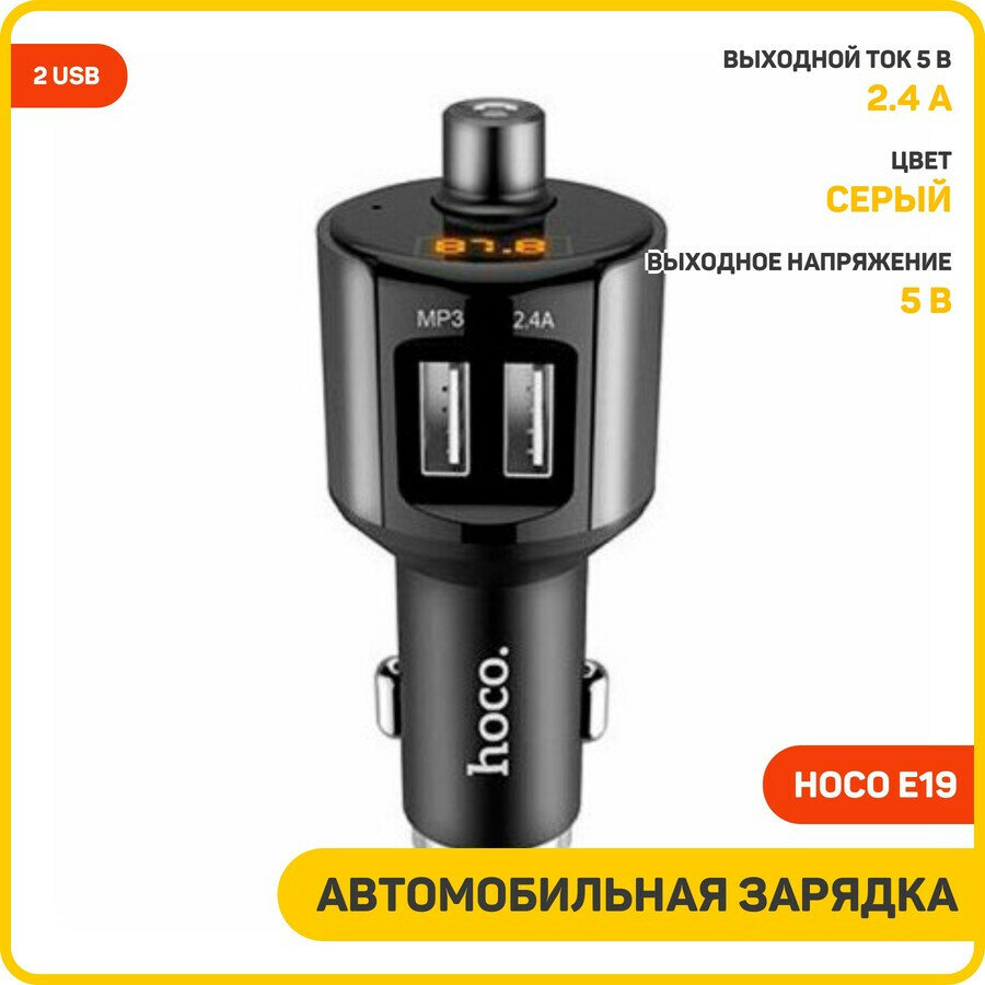 Автомобильное зарядное устройство (АЗУ) Hoco E19 (2 USB / FM-трансмиттер / Bluetooth) 2.4 А, серый