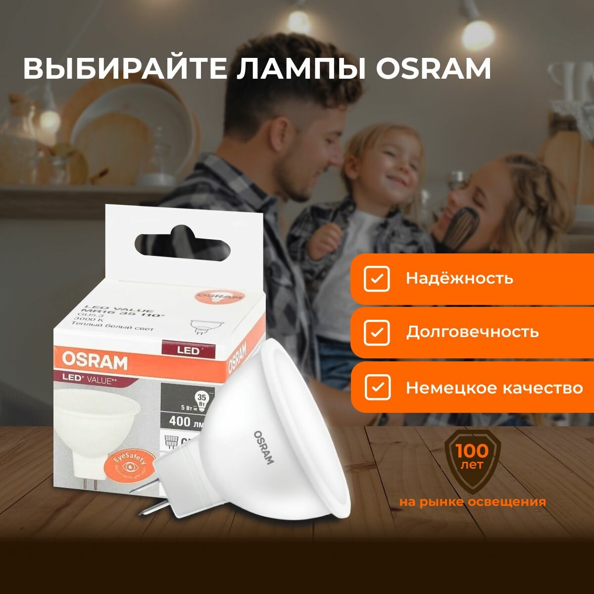 СохранитьСветодиодная лампочка OSRAM GU5.3 5 Ватт 3000К теплый свет MR16 спот 220-240V LED 830, 5W, 400лм, набор 3шт интересное:
