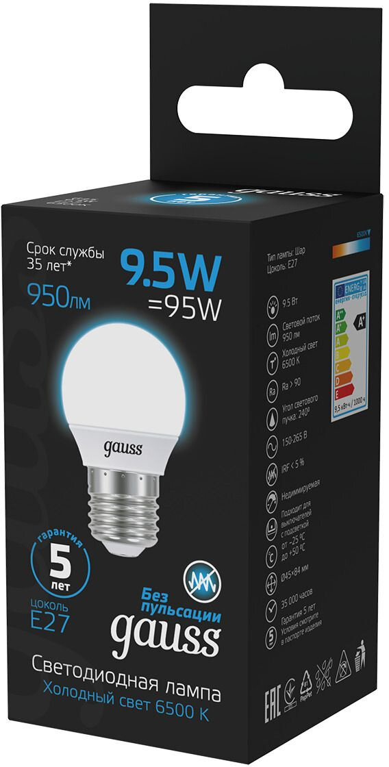 Лампа LED GAUSS 9,5W/Е27/6500К шар 105102310