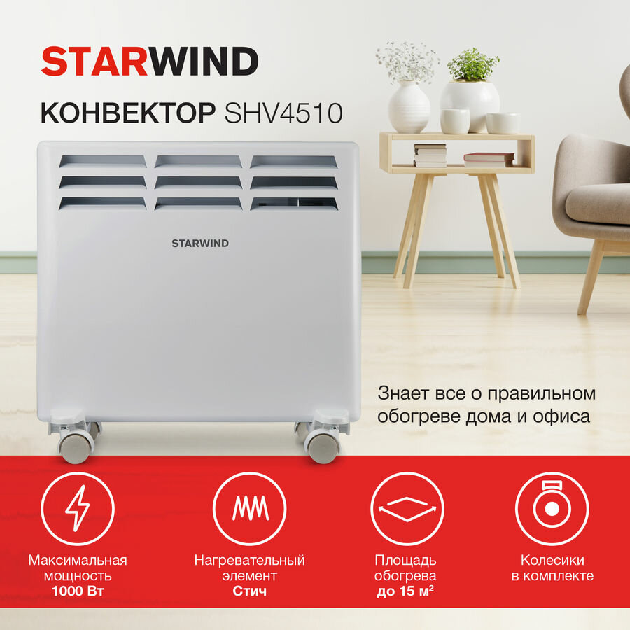 Конвектор Starwind SHV4510 белый, 1000 Вт, 15 м2, термостат