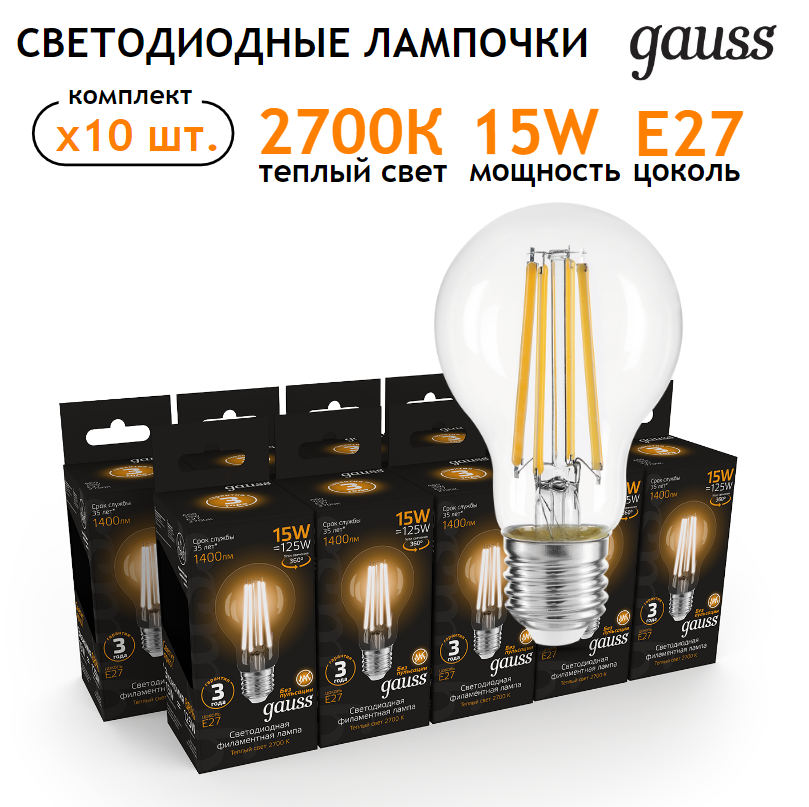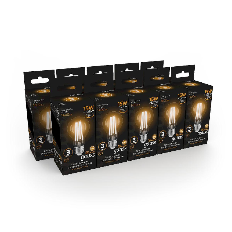 Лампа Gauss Filament А60 15W 1400lm 2700К Е27 LED, упаковка 10 шт.
