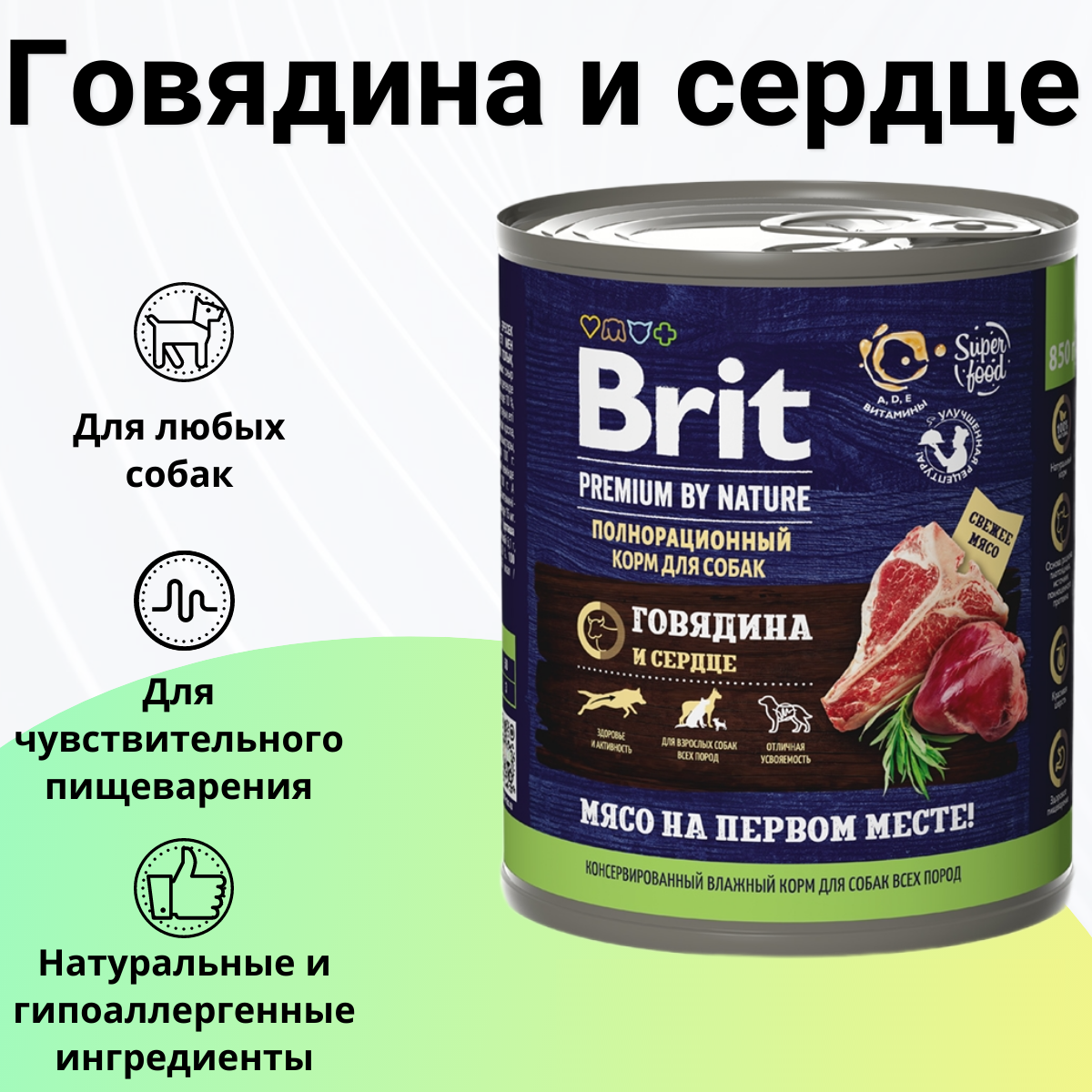 Влажный корм для собак Brit Premium by Nature, для здоровья кожи и шерсти, говядина, сердце 850 г