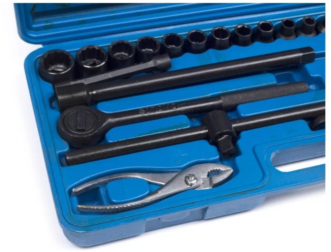 | Головки торцевые подробно | 1/2" (6-гр): 8, 9, 10, 11, 12; 1/2" (12-гр): 13, 14, 15, 17, 19, 22, 24 мм; свечные 1/2" - 21 мм; карданный шарнир 1/2"; удлинитель 1/2" 250 мм; вороток Т-обр 1/2"; трещотка 1/2" |