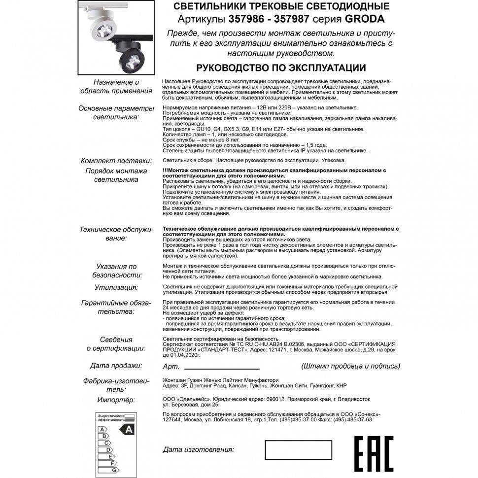 Светильник трековый однофазный трехжильный светодиодный Novotech 357987 GRODA