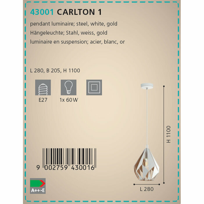Ниже Вы можете прочитать отзывы на Светильник подвесной Eglo Carlton 1 43001, E27, кол-во ламп:1шт., Белый, ознакомится с подробными характеристиками, посмотреть интересные обзоры и фотографии на Светильник подвесной Eglo Carlton 1 43001, E27, кол-во ламп:1шт., Белый.