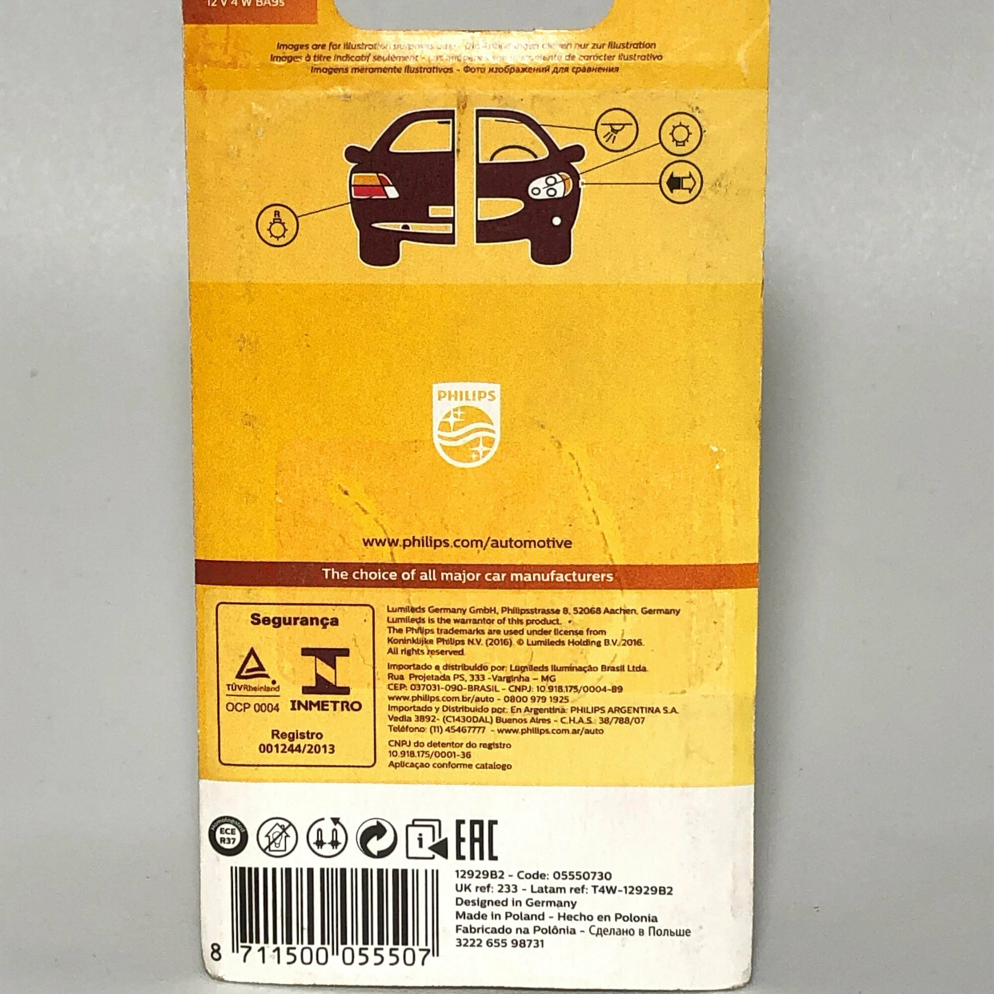 Комплект ламп накаливания блистер 2шт T4W 12V 4W BA9S PHILIPS 12929B2