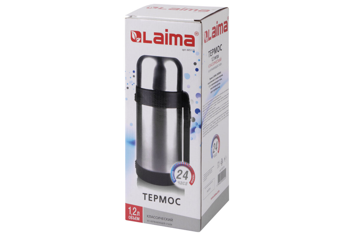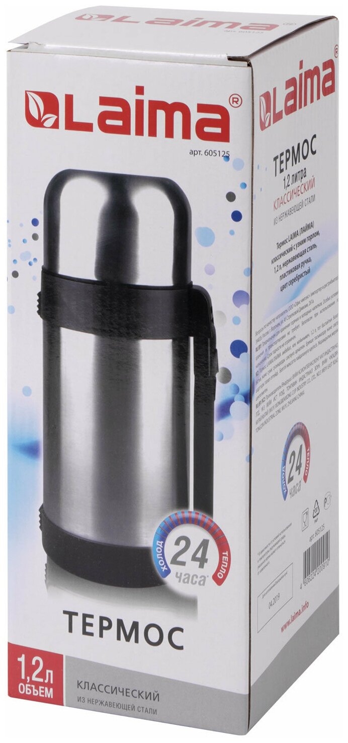 Термос LAIMA классический с узким горлом, 1,2 л, нержавеющая сталь, пластиковая ручка, 605125 - 1 шт.