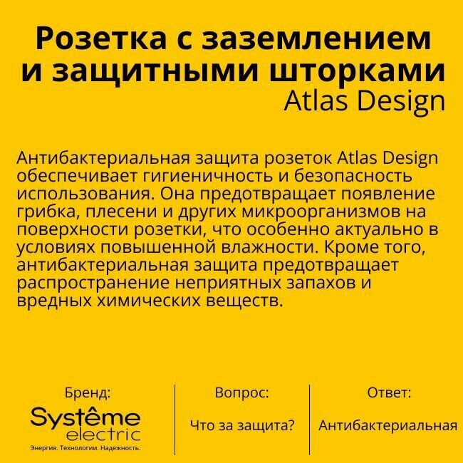 Розетка с заземляющим контактом, со шторками, механизм Монтаж: скрытой установки Цвет: белый Термопласт: антибактериальный, с ионами серебра (Schneider) Systeme Electric AtlasDesign ATN000145 комплект 10шт.