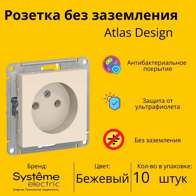 10 шт. Systeme Electric AtlasDesign Бежевая, Розетка без заземления, 16А, механизм, ATN000241