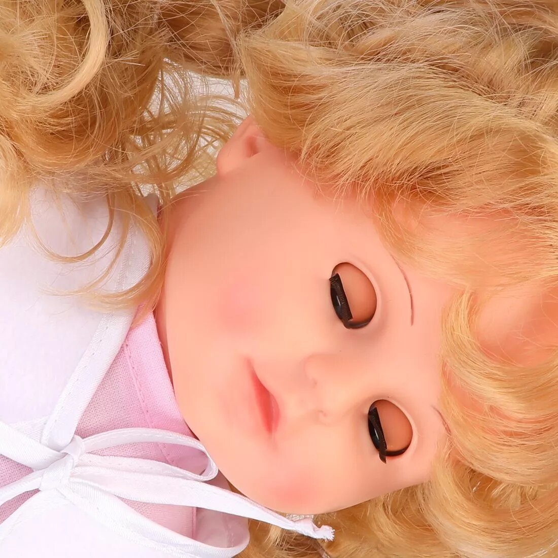 Волосы крепко прошиты по всей голове, выдержат любую игру. Вообще ощущение крепкости, добротности, практичности - не жалко дать ребенку, нет опасений, что сломает. Глазки спящие - дети такие любят. Одежда многослойная, есть панталончики. Ботиночки очень приятные и добротные. |