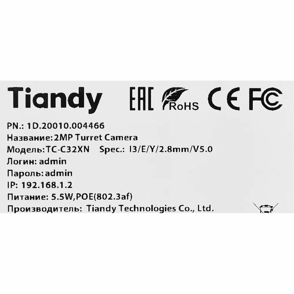 Видеокамера IP TC-C32XN Spec:I3/E/Y/2.8mm/V5.0 Tiandy 00-00017172