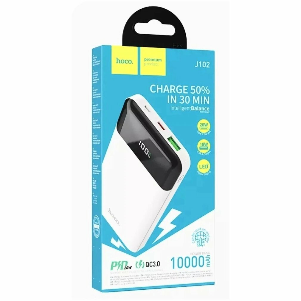 Купить Универсальный Доп. Аккумулятор 10000mAh, J102, HOCO, выход: 1 USB (18W)+1 PD 20W, белый