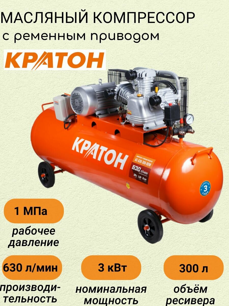 Компрессор с ременной передачей Кратон AC-630-300-BDW, 10 бар, 630 л/мин, 3000 Вт, 300л интересное: