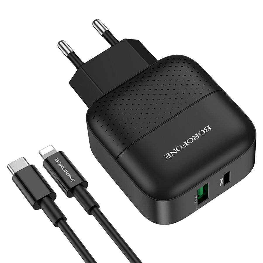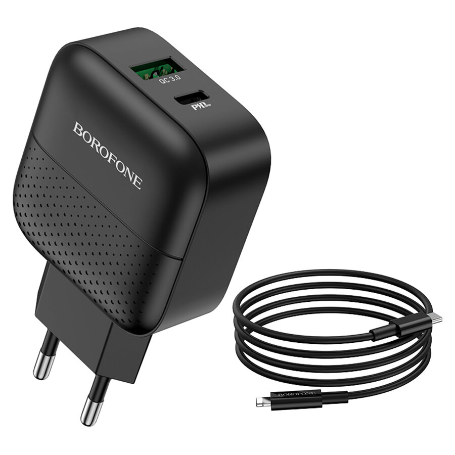 Сетевой адаптер питания Borofone BA46A Premium зарядка 1 порт USB-C PD 18W + USB-A QC3, 3.0А + кабель Lightning, черный