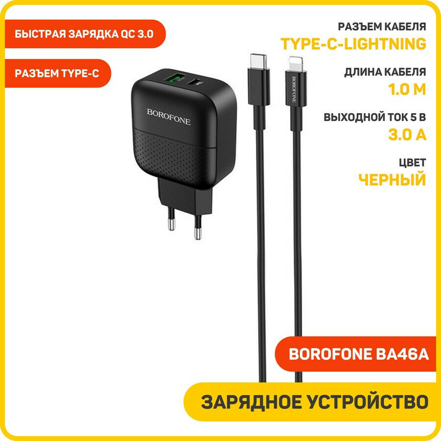 Сетевое зарядное устройство/Зарядка для телефона/Borofone BA46A Premium (USB+Type-C) Quick Charger 3.0 (черный) + кабель Type-C-Lightning