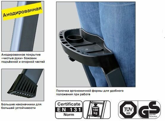 | Плюсы: | Лёгкая , устойчивая, удобные ступеньки с полкой под инструмент. Солидно смотрится. |